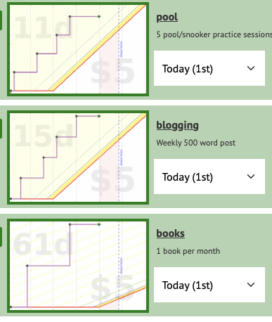 All of the above means my Beeminder charts are all well ahead of the dreaded red lines, so no fines for me this month. I did allow a limited grace period assuming I might be slow to hit the reading target in the first week or so given that I was targeting a book read in a month.